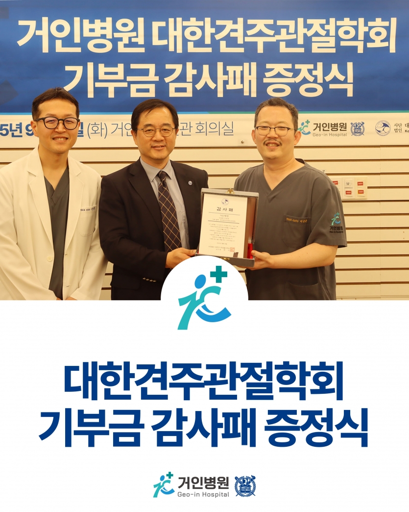 거인병원이 대한견주관절학회로부터 기부금 감사패를 전달받았습니다.