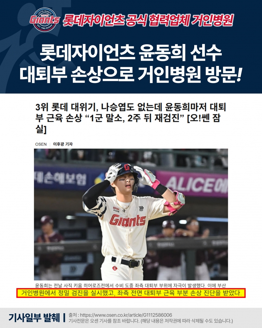 롯데자이언츠 윤동희 선수가 대퇴부 근육손상으로 거인병원을 방문하여