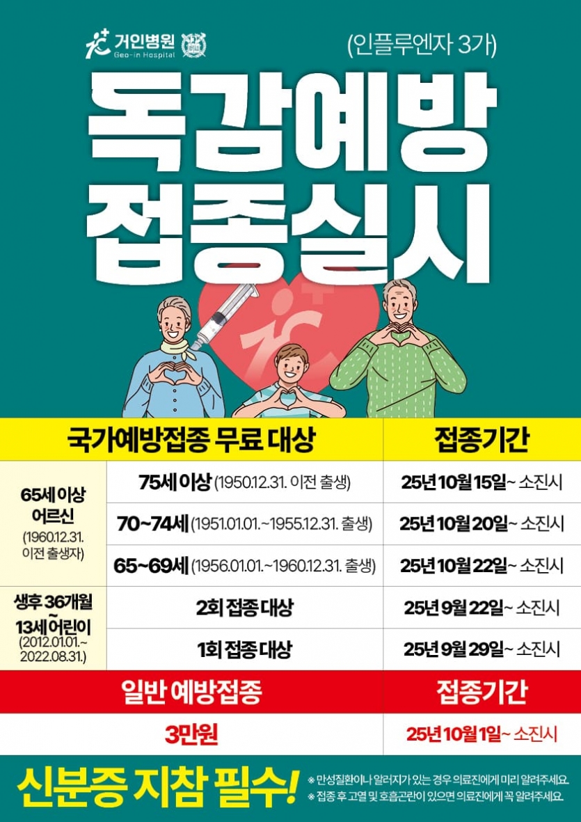 25년도 독감 예방접종 실시 페이지 정보 작성자거인병원 등록일 2025-09-23 11:54 조회563 본문 목록 다음글더 가까운 케어, 더 안심되는 입원생활! 거인병원 간호간병통합서비스 인력 기준이 향상되었습니다. 25.04.22