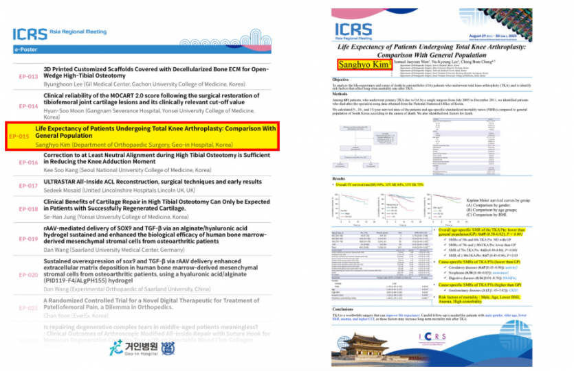 세계 각국 전문가들이 모인 ICRS 아시아 학술대회에서 "인공관절 치환술과 환자의 수명"을 주제로